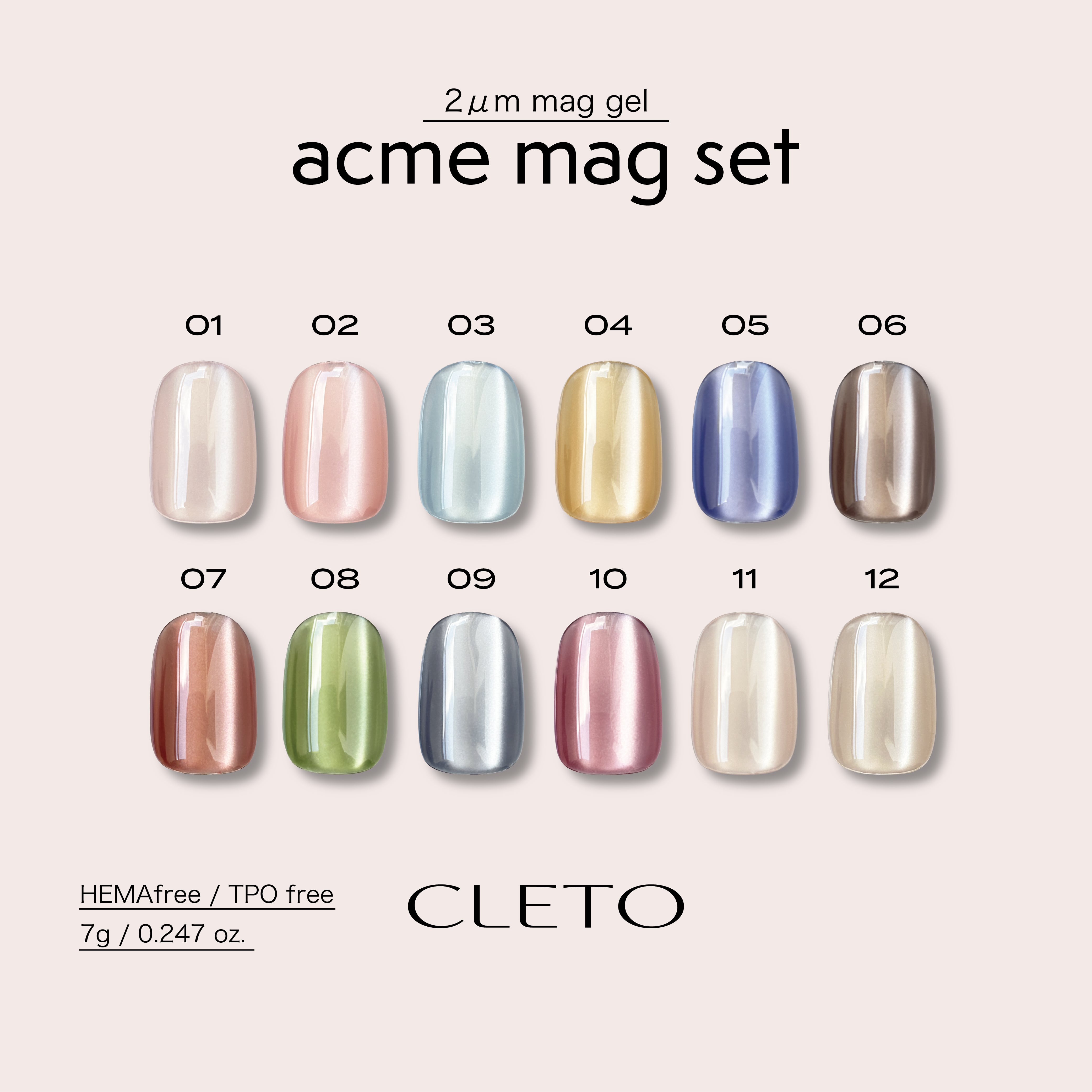 ▪️3/31 20:00発売開始 ※3/31 20:00〜4/10 23:59まで【20%OFF】 ▪️acme mag 12色セット(01 - 12)台紙付 【容量】7g×12色 【硬化時間】LED30秒/UV60秒 【特徴】 2μmの超微粒子マグシリーズ。HEMAフリーTPOフリー ※見ているデバイスにより色味に多少の誤差が生じる場合がございます。予めご了承ください。 ※長期間使用していない場合は、数回振ってから使用してください。